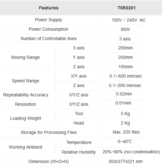 have a maximum base work area of 200mm x 200mm and a up and down movement of